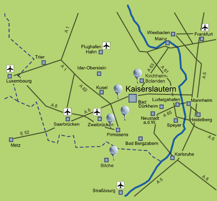 Because the green heart of the Palatinate is a strong one for golfing. In the surroundings of Kaiserslautern various golf courses present the scenic variety. Whether on the southern slope of the Donnersberg with a wide view over the landscape, surrounded by one of the largest contiguous forest areas in Germany or bordering on the edge of the Vosges - discover 'golfing' hospitality and passion of the Pfalz.